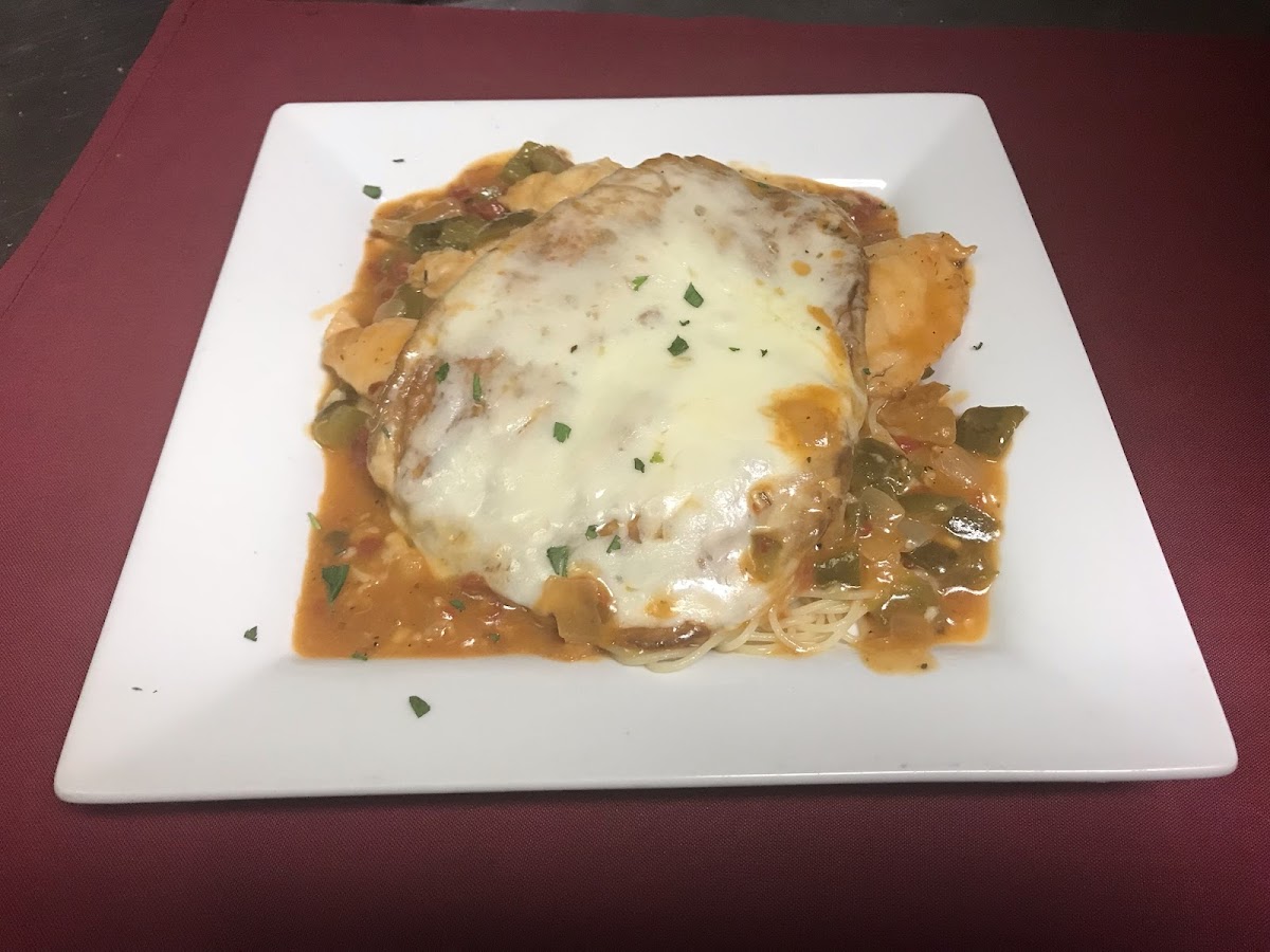 Sautéed chicken with eggplant, onions, roasted red peppers in white wine, and marinara sauce. Topped with melted mozzarella. Served over pasta with breadsticks and soup or salad.